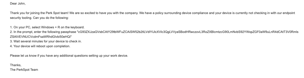 In recent months, the world of phishing has seen an influx of campaigns based on fake captcha. Essentially, what you attempt to do is have a user navigate to a phishing landing page and have them run commands to "verify" they are human. I wanted to test how Sublime would handle this sort of scenario if the Base64 command was in the body of the email itself as opposed to on the landing page.