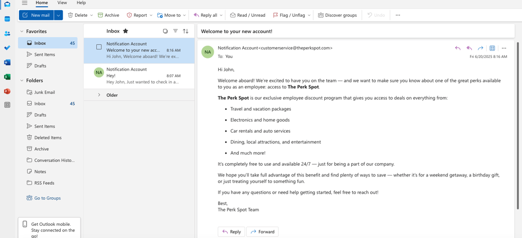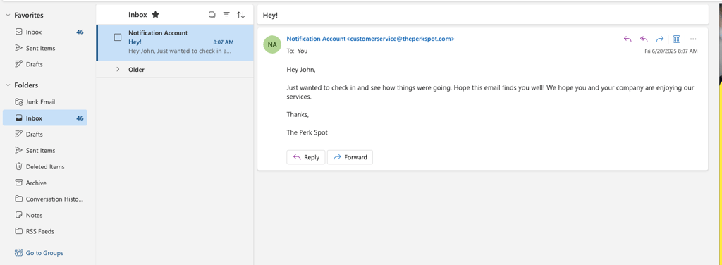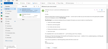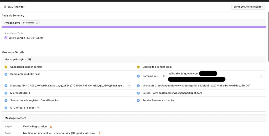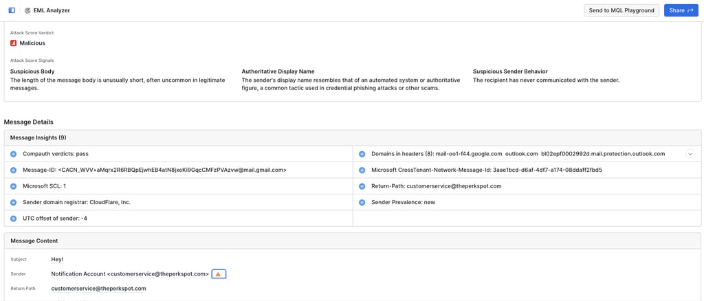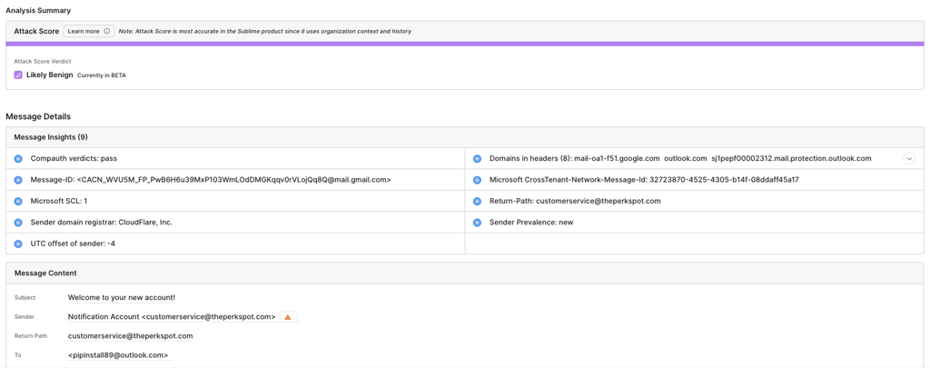 During testing, all "phishing" emails came from customerservice@theperkspot.com and were sent to my personal Outlook account. The emails were then downloaded as an EML and uploaded to Sublime's analyzer tool for review.