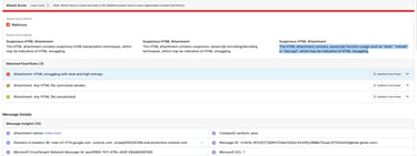 One of the rules that triggered detection was "The HTML attachment contains Javascript function usage such as 'atob' , 'onload' or 'decrypt', which may be indicative of HTML smuggling." With this in mind, I rework the HTML to avoid using 'atob':