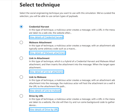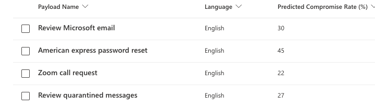 Now we have payload selection. You will have two options: Global or Tenant. Global payloads are emails and landing pages made by Microsoft and come with Defender. Tenant payloads are custom made by you or another internal employee. Again, this is the first campaign so we will use a Global payload.