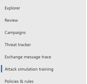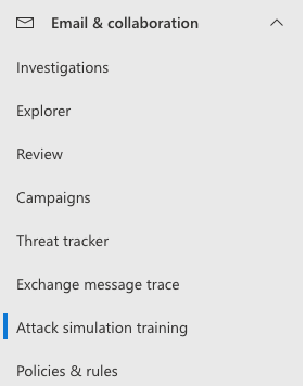 From the main screen, click into the side panel and navigate to "Email & Collaboration" > "Attack simulation training"