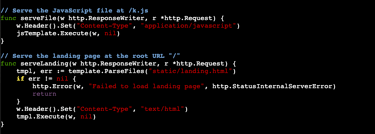 Last we get to our main function. This will set up the router that was defined with gorilla/mux and will call back to the functions defined earlier such as serveLanding. Additionally, it prints to the terminal the listening address when started: