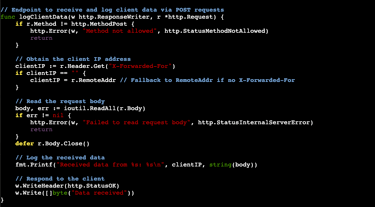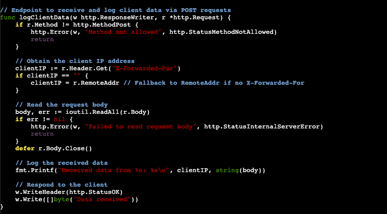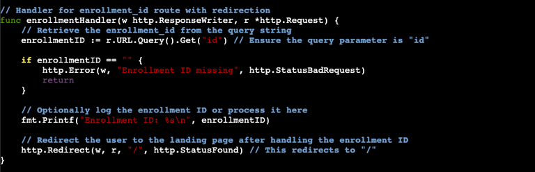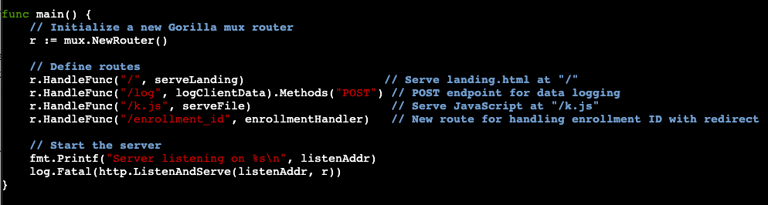 Looking through the code you can see where we are looking to log the IP and retrieve the enrollment ID. The enrollment IDs are defined in our Javascript file and one of the first thing the code does is to look and see if the ID number is present. The fmt.Printf part of the code will print the enrollment ID into the terminal as it comes in. The last part of the code routes the end user to the main landing page (where the credential capture will take place).