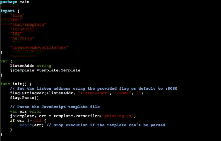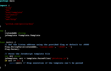 The code begins by importing libraries. We won't take the time to walk through each one, but I do want to call out two of them. The first one to address is "net/http". This is basically the backbone of the server. This library allows us to be able to stand the server up and use it on the web. Another one to mention is "github.com/gorilla/mux." This library allows us to essentially establish a router and provides more functionality to our working with HTTP. The next portion of this code sets the variables of the listening address of the server and specifically what port it will be using. The other var references the JavaScript template which we will get to in Part 2. After this we get into our first function where we set the listening port to 8080 and tell it to parse our phishing.js file (again, coming in Part 2).
