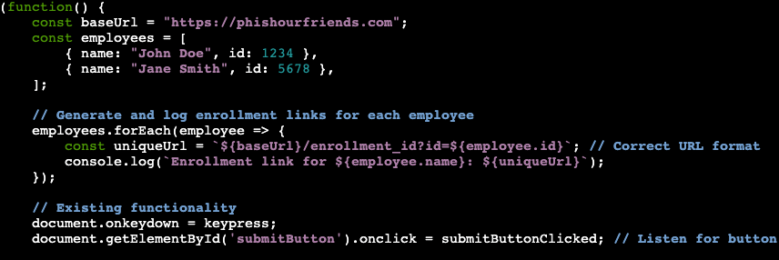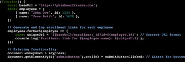 In part one, we created the file phishing.js. This file is where we will be putting the JavaScript. As a refresh from part one, our website will be tracking which user clicks by matching the enrollment ID number with the employee. For example, if we email John Doe about enrolling in his company perks portal the URL would be https://phishourfriends.com/enrollment_id?id=1234.